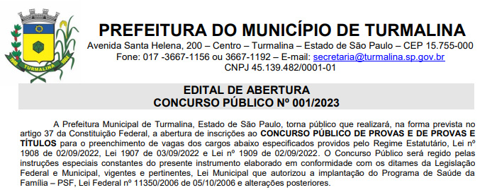A Prefeitura Municipal de Turmalina-SP abriu inscrições para o Concurso Público nº 001/2023 ofertando 20 vagas para profissionais de diversas áreas, com exigência de nível fundamental ao superior.