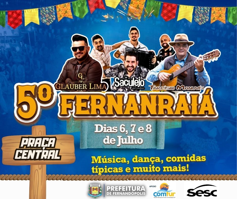 O palco de shows da Praça Central vai receber três grandes atrações que prometem animação total durante o 5º Fernanraiá. Na quinta, 06, primeira noite de festa, o show ficará por conta de Tarcísio Manuvéi, cantor e produtor musical que virá direto de Minas Gerais para animar a festa de Fernandópolis. Já no dia 07, a animação será com Glauber Lima e um repertório sertanejo e raiz.