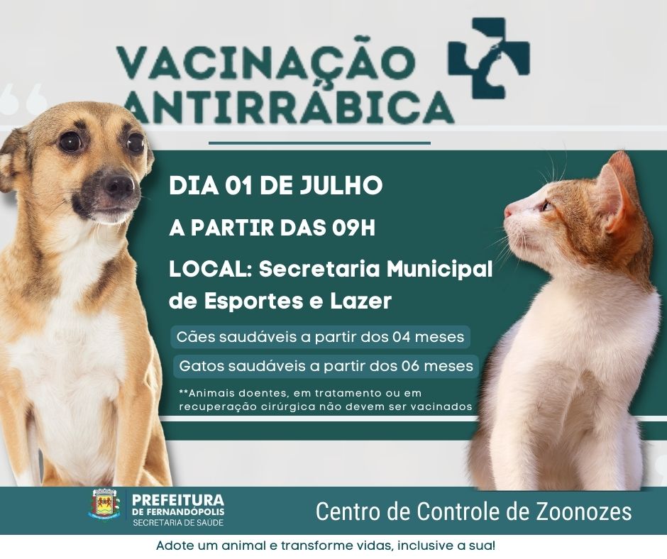 A Prefeitura de Fernandópolis, por meio da Secretaria Municipal da Saúde, com coordenação do Centro de Controle de Zoonoses, prepara mais uma campanha de vacinação antirrábica em cães e gatos.