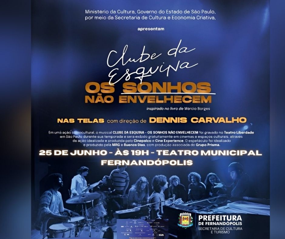 A noite do próximo domingo será cultural em Fernandópolis com a apresentação do filme “Clube da esquina, os Sonhos não envelhecem”, um musical com direção do renomado Dennis Carvalho, que conta a história de um grupo de jovens amigos que se reuniam em Belo Horizonte para compor e cantar. Destes encontros, que começaram 50 anos atrás, saíram grandes nomes da música, entre eles Milton Nascimento.