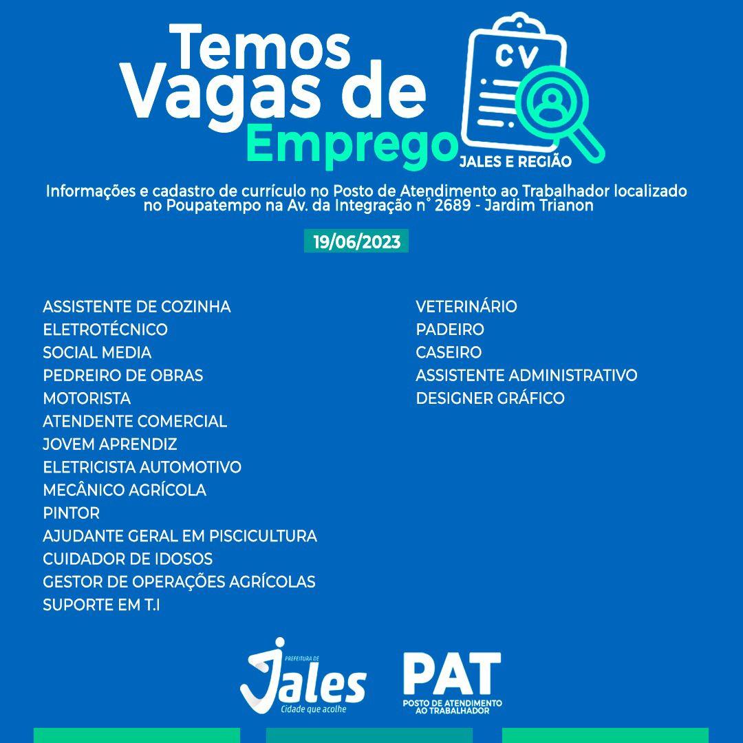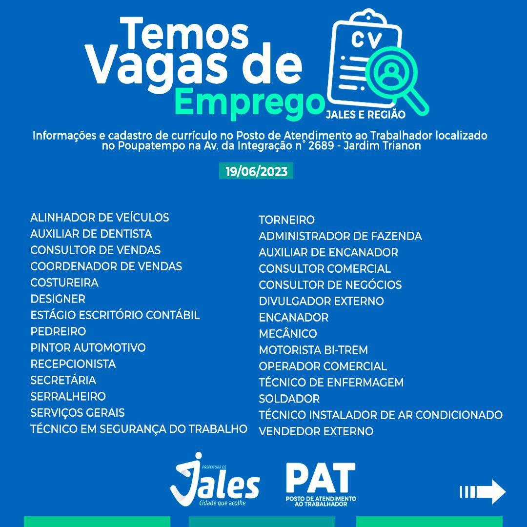 Novas oportunidades de emprego disponíveis no Posto de Atendimento ao Trabalhador de Jales (PAT) para começar a semana com o pé direito. Acesse as informações em https://jales.sp.gov.br/cidadao/balcao-de-empregos e garanta a sua vaga!