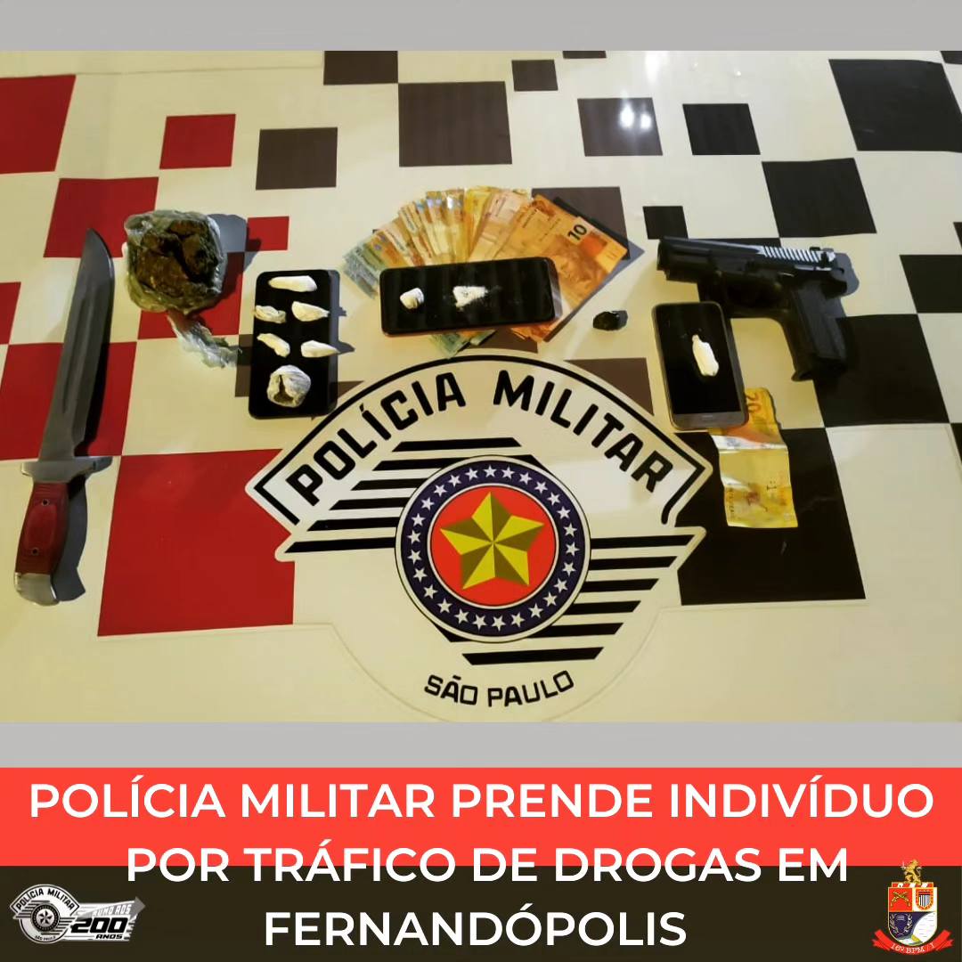 Na noite de ontem, dia 20, a Polícia Militar prendeu um indivíduo por tráfico de drogas e apreendeu um simulacro de arma de fogo, em Fernandópolis.