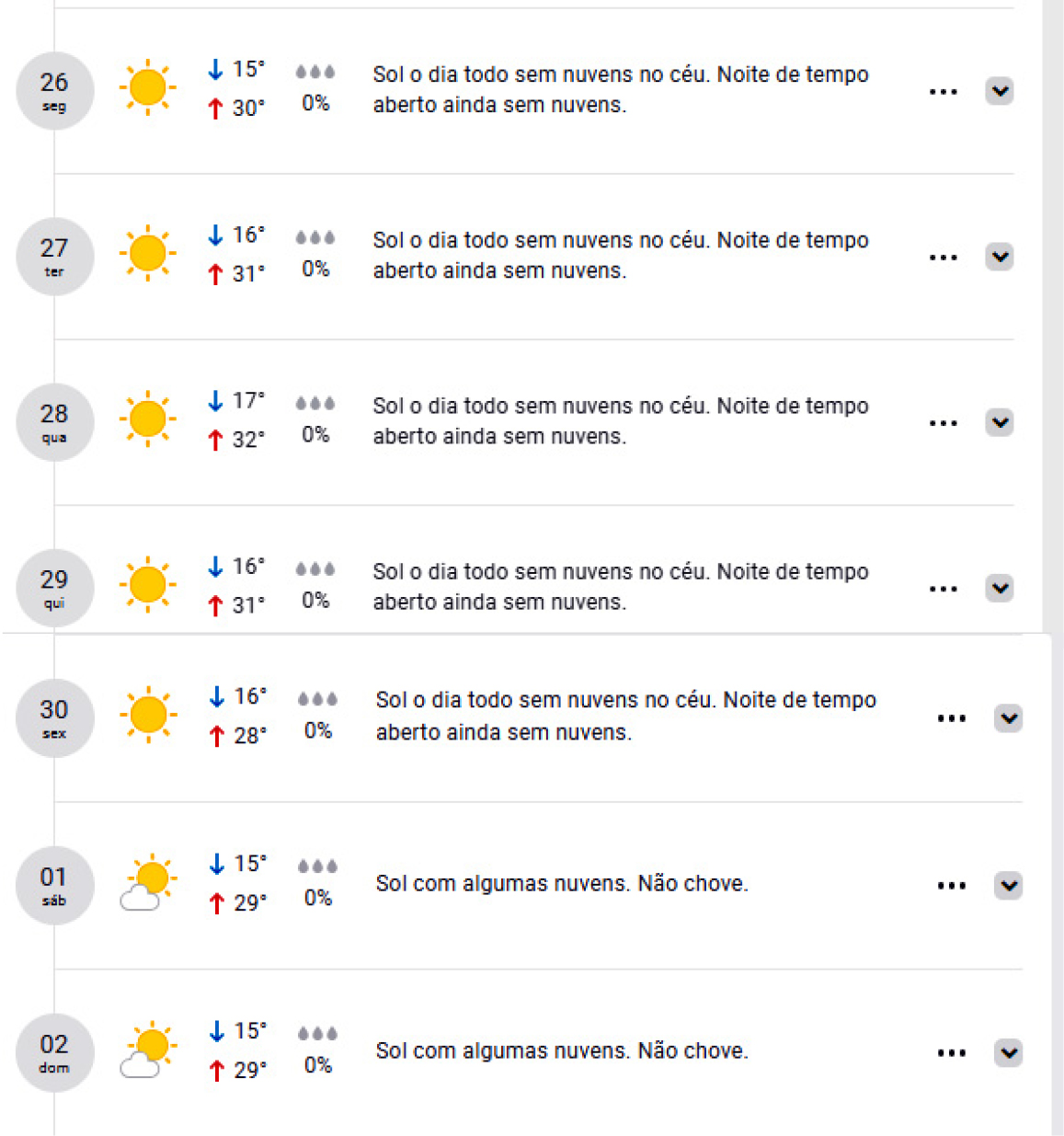 A temperatura está em alta, com a máxima atingindo 32º na quarta-feira, 28, tendo como mínima 15º em três dias.