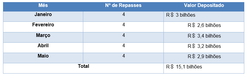 Os municípios já haviam recebido R$ 1,44 bilhão nos repasses anteriores, realizados em 6, 13 e 20 de junho. Com os depósitos efetuados hoje, o valor acumulado distribuído às prefeituras neste mês sobe para R$ 2,83 bilhões.
