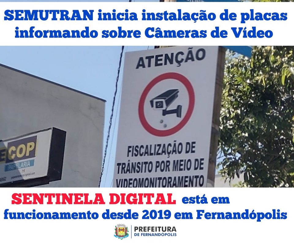 "A SEMUTRAN – Secretaria Municipal de Trânsito de Fernandópolis vem esclarecer que as placas com a informação ‘fiscalização de trânsito por meio de videomonitoramento’, tem por objetivo informar motoristas e pedestres, que no município existe o sistema de Câmeras de Vigilância.