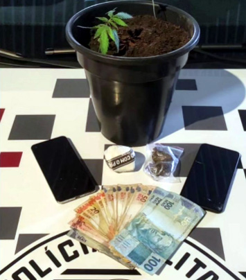 Com ela foi localizada uma porção de cocaína e 02 aparelhos celulares. Realizada diligência na moradia onde foram localizados uma porção de maconha e a quantia de R$ 1.064,00, uma munição intacta de calibre 44 e um soco inglês. Sobre o tanque de lavar roupas havia um vaso onde estava sendo cultivado três pés de maconha.