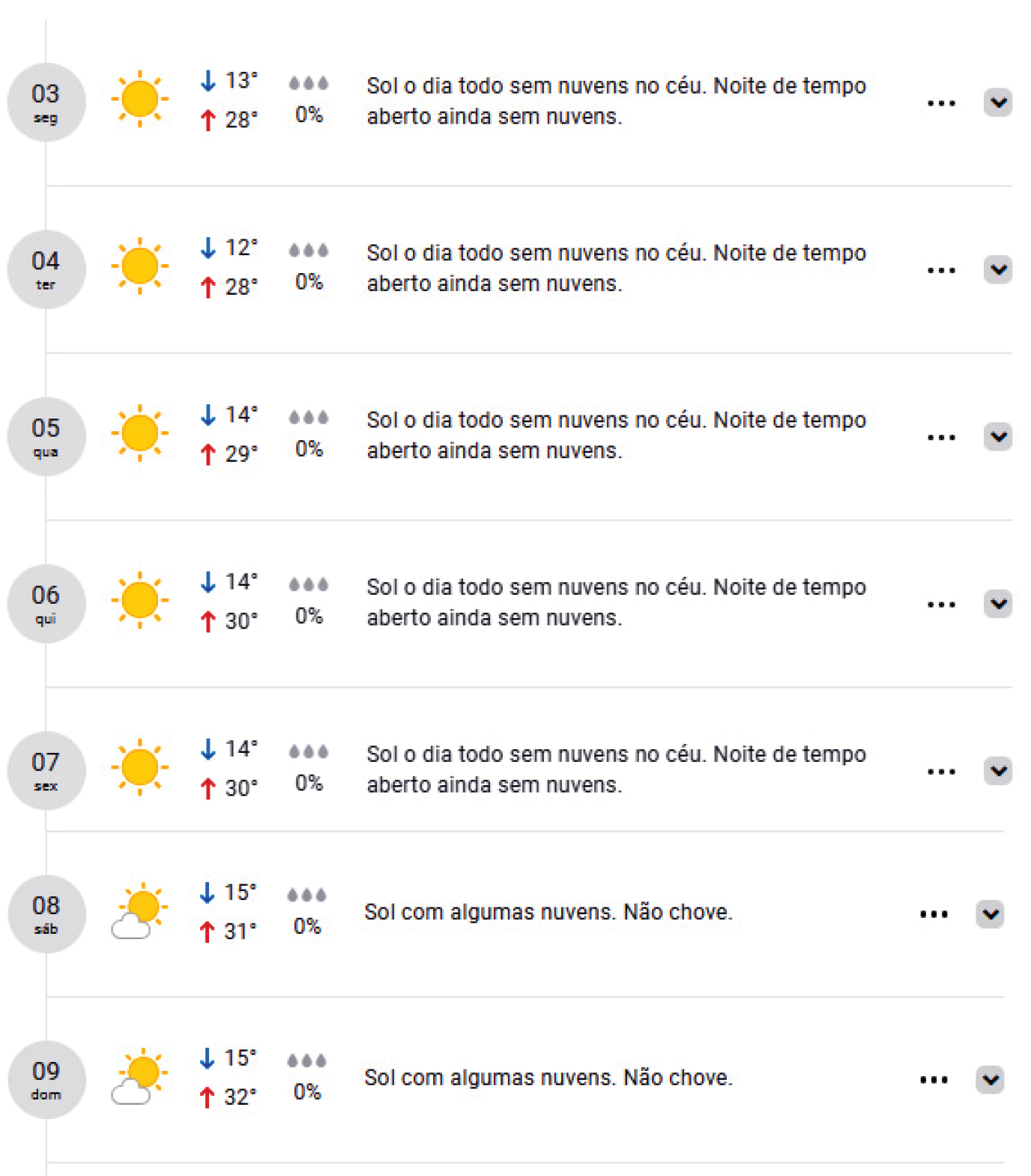 A maioria dos dias terá tempo aberto, sem nuvens e com sol o dia todo, com a temperatura variando da mínima de 12º na terça-feira, 04, até 32º no domingo, 09.