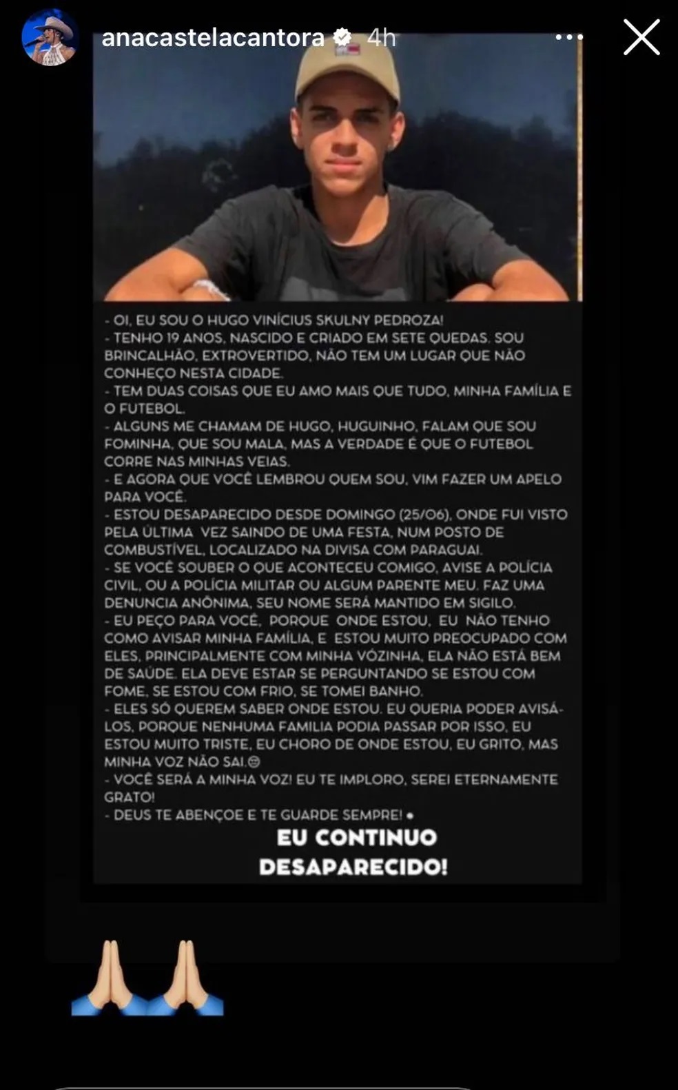 Ela compartilhou no perfil do Instagram cartaz com informações com uma foto de Hugo. Com 8,8 milhões de seguidores, Ana Castela cresceu em Sete Quedas (MS), onde morava o jogador.