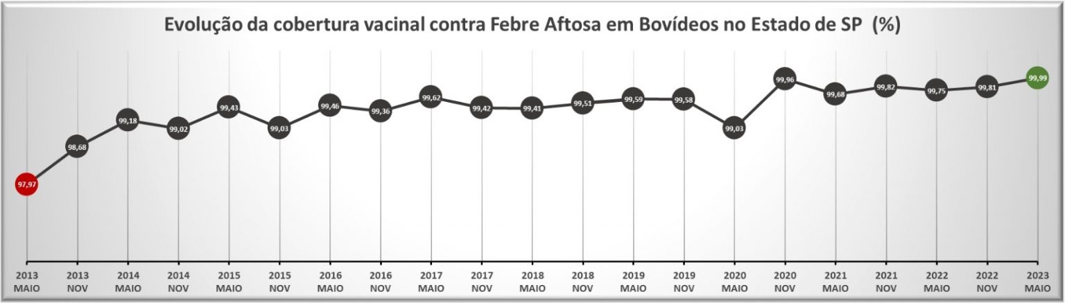 No quadro abaixo, a evolução da cobertura vacinal contra a Febre Aftosa no Estado de São Paulo, confira: