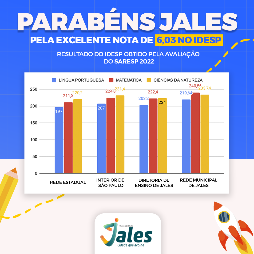 A Prefeitura de Jales, por meio da Secretaria Municipal de Educação, anuncia o excelente resultado no desempenho do ensino e aprendizagem, demonstrado pelo índice do IDESP (Índice de Desenvolvimento da Educação do Estado de São Paulo), que alcançou a nota de 6,03 relativo à prova aplicada em 2022.