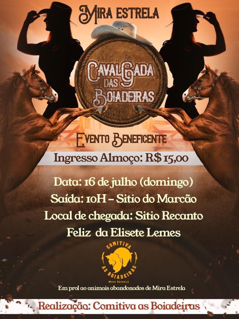 No próximo domingo, dia 16, será realizada, em Mira Estrela, município localizado a 37 quilômetros de Fernandópolis, a Cavalgada das Boiadeiras, evento beneficente em prol dos animais abandonados.