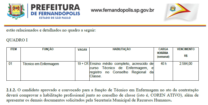 A Prefeitura Municipal de Fernandópolis abriu processo seletivo simplificado para a contratação de 19 técnicos em Enfermagem.