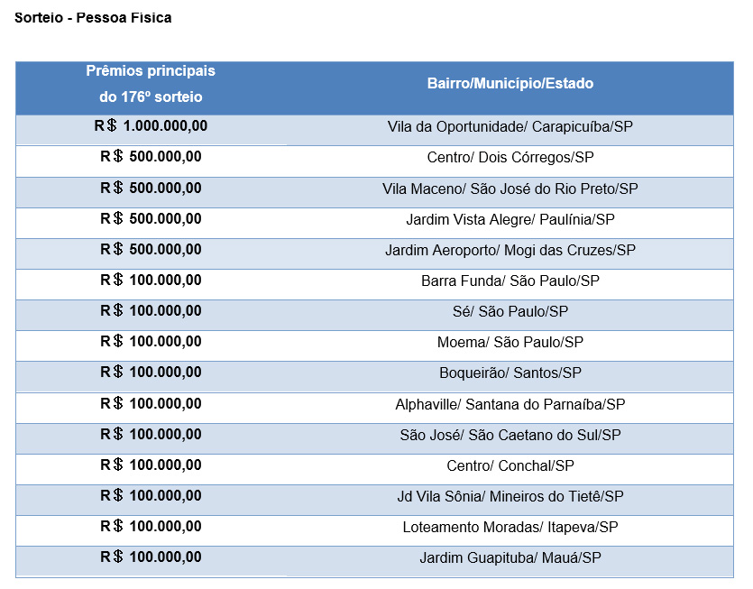 Os quatro prêmios de maior valor para Pessoa Física, de R$ 500 mil cada, vão para consumidores das cidades de Dois Córregos, São José do Rio Preto, Paulínia e Mogi das Cruzes.