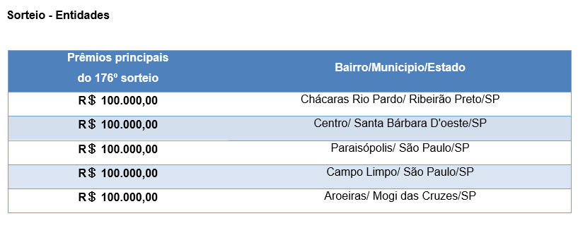 As instituições filantrópicas também concorreram a outros 50 prêmios de R$ 10 mil. Outras pessoas físicas e condomínios foram sorteados com 10 prêmios de R$ 100 mil, 15 de R$ 50 mil, 20 de R$ 10 mil, 50 de R$ 5 mil e 500 prêmios de R$ 1 mil.