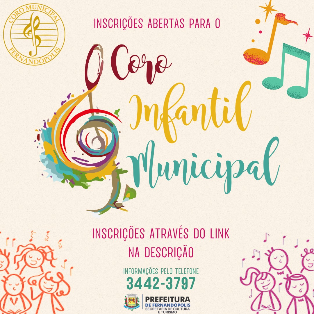 A Secretaria Municipal de Cultura e Turismo informa que estão abertas as inscrições para as crianças de 08 a 12 anos de idade interessadas em participar do Coro Municipal Infantil. Os ensaios são conduzidos pelo maestro Sandro Muniz, as quartas-feiras, às 19h, no Teatro Municipal, com duração de uma hora.