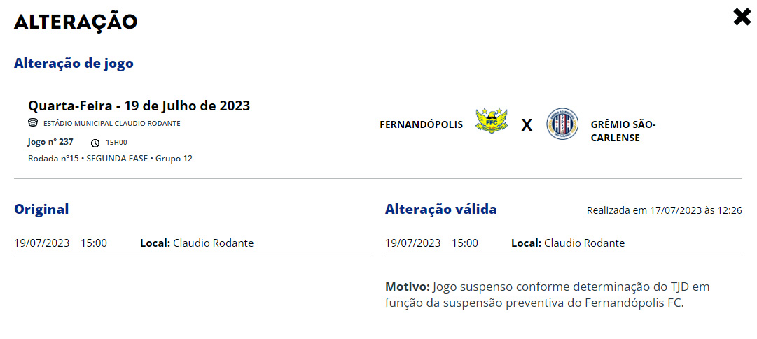 Com a suspensão, a partida entre Fernandópolis e Grêmio São-Carlense, prevista para ocorrer no Estádio Municipal Cláudio Rodante, amanhã à tarde e válida pela 15ª rodada da segunda fase, esta adiada.