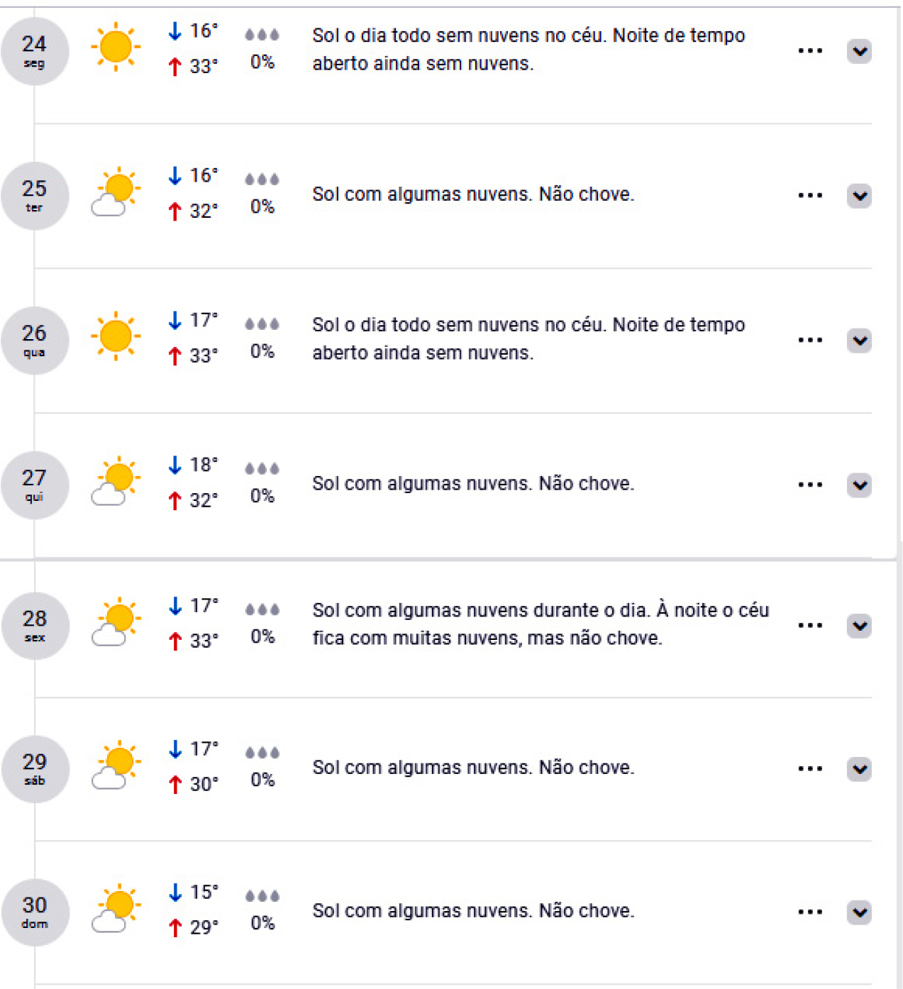 A temperatura mínima será de 15º as ser registrada no próximo sábado, 29, e a máxima na segunda, 24 (e também na sexta-feira, 28) de 33º.