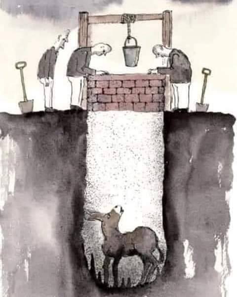 Após horas, o camponês tomou uma decisão cruel: concluiu que já que o burro estava muito velho e que o poço estava mesmo seco, precisaria ser tapado de alguma forma. Portanto, não valia a pena esforçar-se para tirar o burro de dentro do poço.