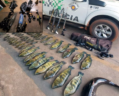 Equipe de Policiais Militares do 4º Batalhão de Polícia Ambiental flagrou e autuou três pessoas praticando pesca subaquática sem respeitar a legislação vigente, na Represa de Água Vermelha, em Mira Estrela/SP.