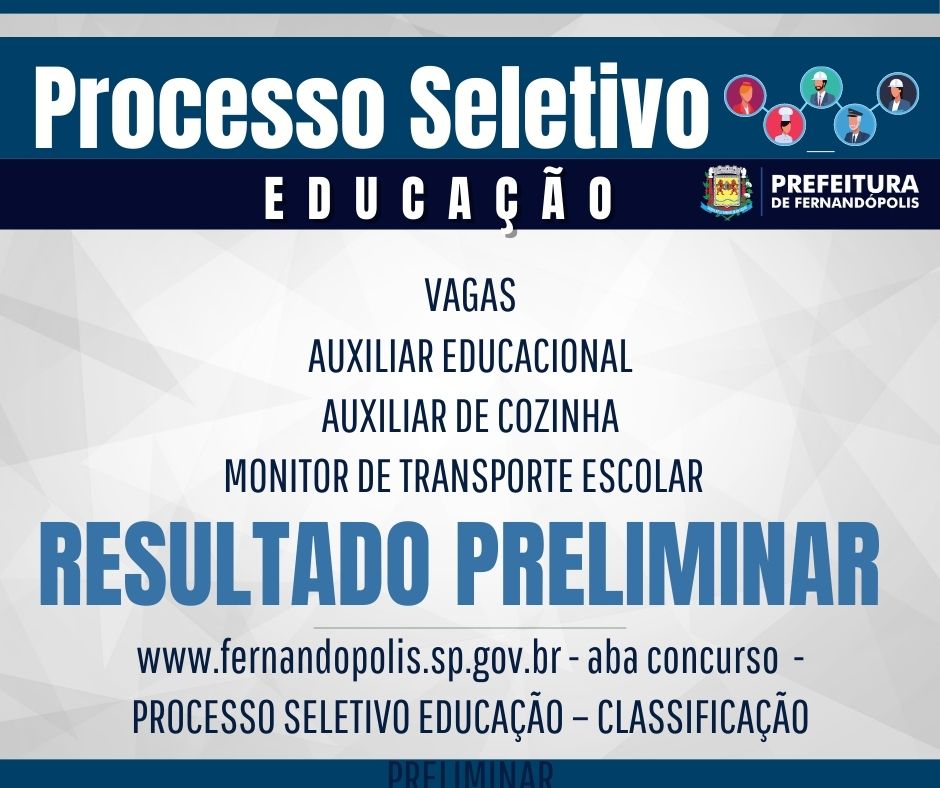 A Prefeitura de Fernandópolis, por meio da Secretaria Municipal de Educação, publicou nesta sexta-feira, 04, o edital com os resultados do processo eletivo que está em andamento para a contratação de Auxiliar de Cozinha (04 vagas + cadastro reserva); Auxiliar Educacional (69 vagas + cadastro reserva e Monitor de Transporte Escolar (01 vaga + cadastro reserva).