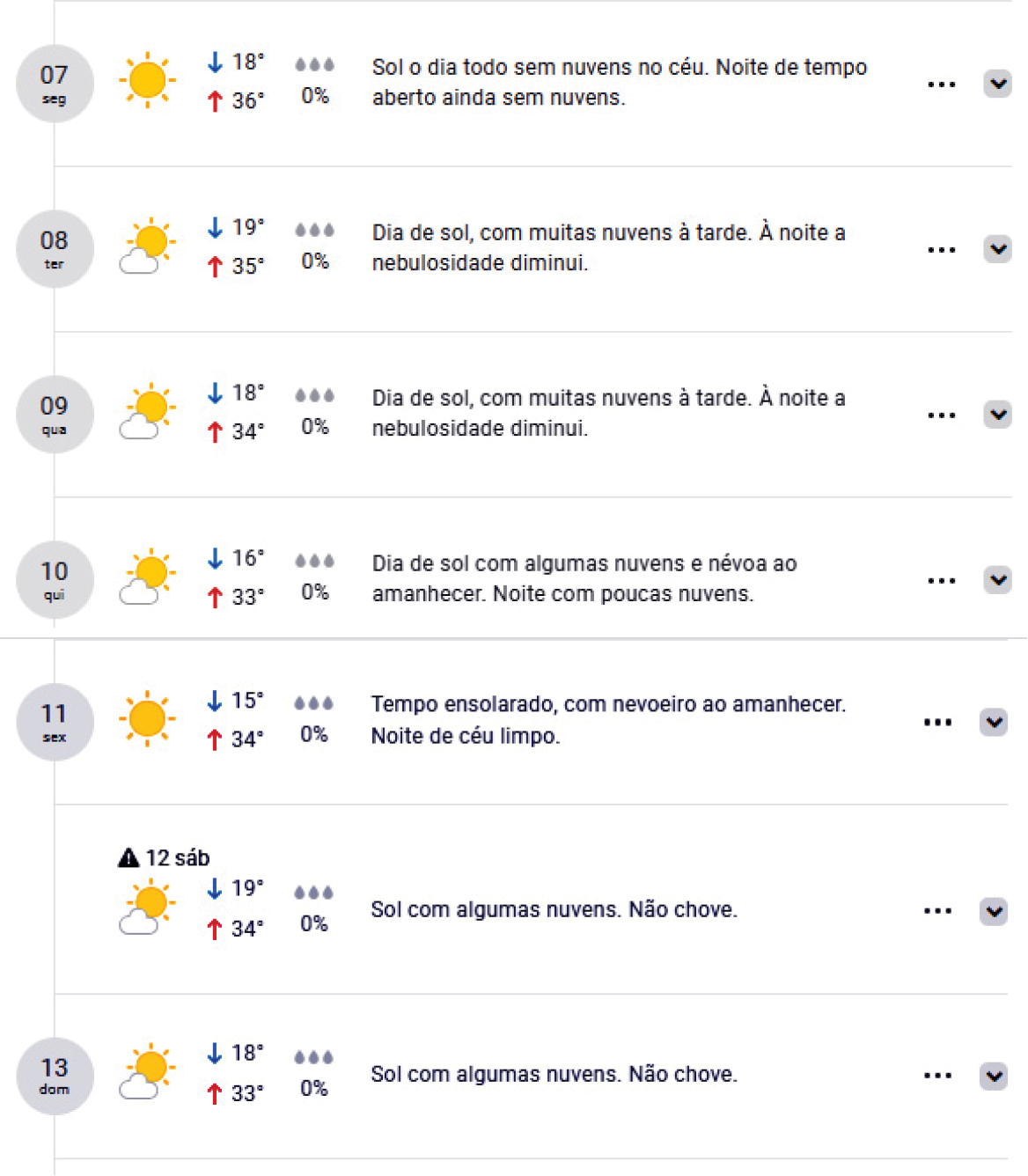 Segundo o instituto, a temperatura mais baixa será registrada na sexta-feira, 11, com 15º e a mais alta nesta segunda-feira, 07, batendo nos 36º.
