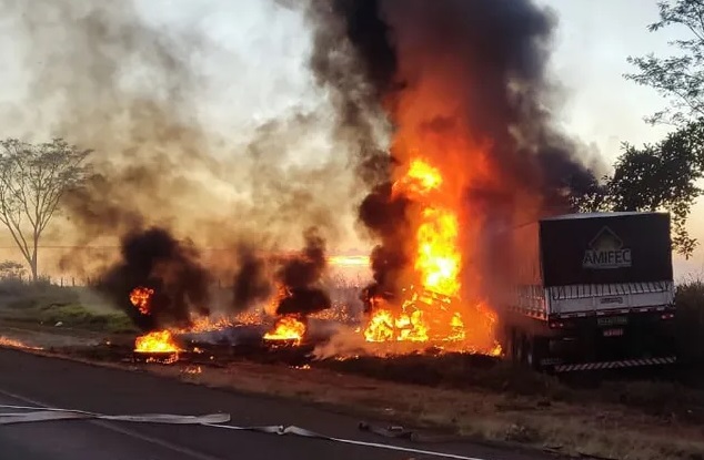 A caminhonete ficou presa embaixo do caminhão e ambos veículos pegaram fogo e ficaram completamente destruídos. Duas viaturas do Corpo de Bombeiros foram mobilizadas no combate às chamas.