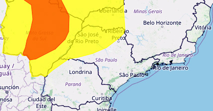 O perigo é classificado como ‘alerta laranja’ para as regiões do Paraná, Santa Catarina, Rio Grande do Sul e Mato Grosso do Sul, onde são esperados ventos intensos, de 60 km/h a 100 km/h, além de intempéries como chuvas de 30 mm a 60 mm por hora (ou 50 a 100 mm por dia) e queda de granizo.