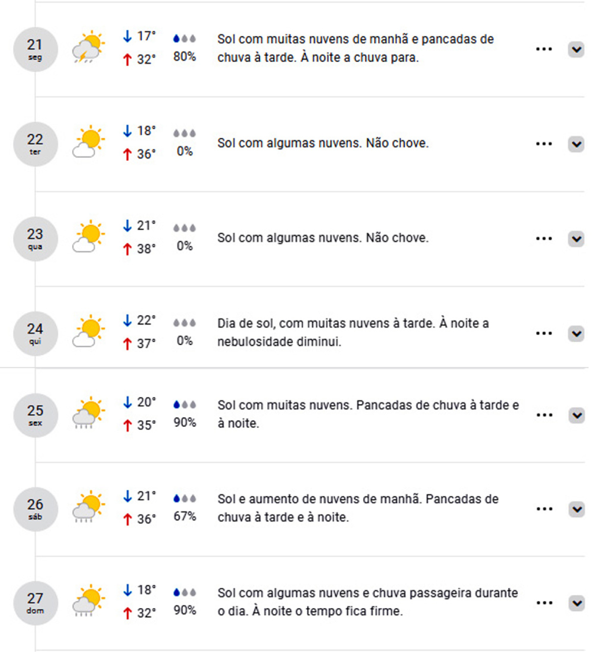 Na terça, quarta e quinta-feira, apesar das nuvens, não haverá chuvas, que voltam na sexta-feira, 25, e ficam até sábado, 26. com índices de 5mm e 2mm, respectivamente. No domingo não deve chover.