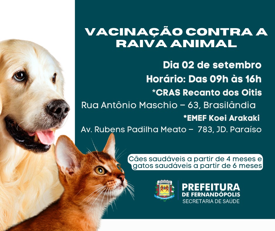 A Prefeitura de Fernandópolis, por meio da Secretaria Municipal da Saúde, com coordenação do Centro de Controle de Zoonoses, programa mais uma data para vacinação contra a raiva animal. A ação dupla está prevista para o dia 02 de setembro e acontecerá em dois locais.