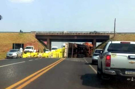 Um caminhão que transportava 3,2 mil frango, por motivos a ser apurados, tombou na rodovia, espalhando a carga no asfalto e interrompendo temporariamente o trânsito.