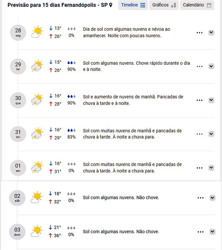 A menor temperatura desse período semanal é de 13º, nesta segunda-feira, 28, e a maior será no domingo, 03, com 36º.