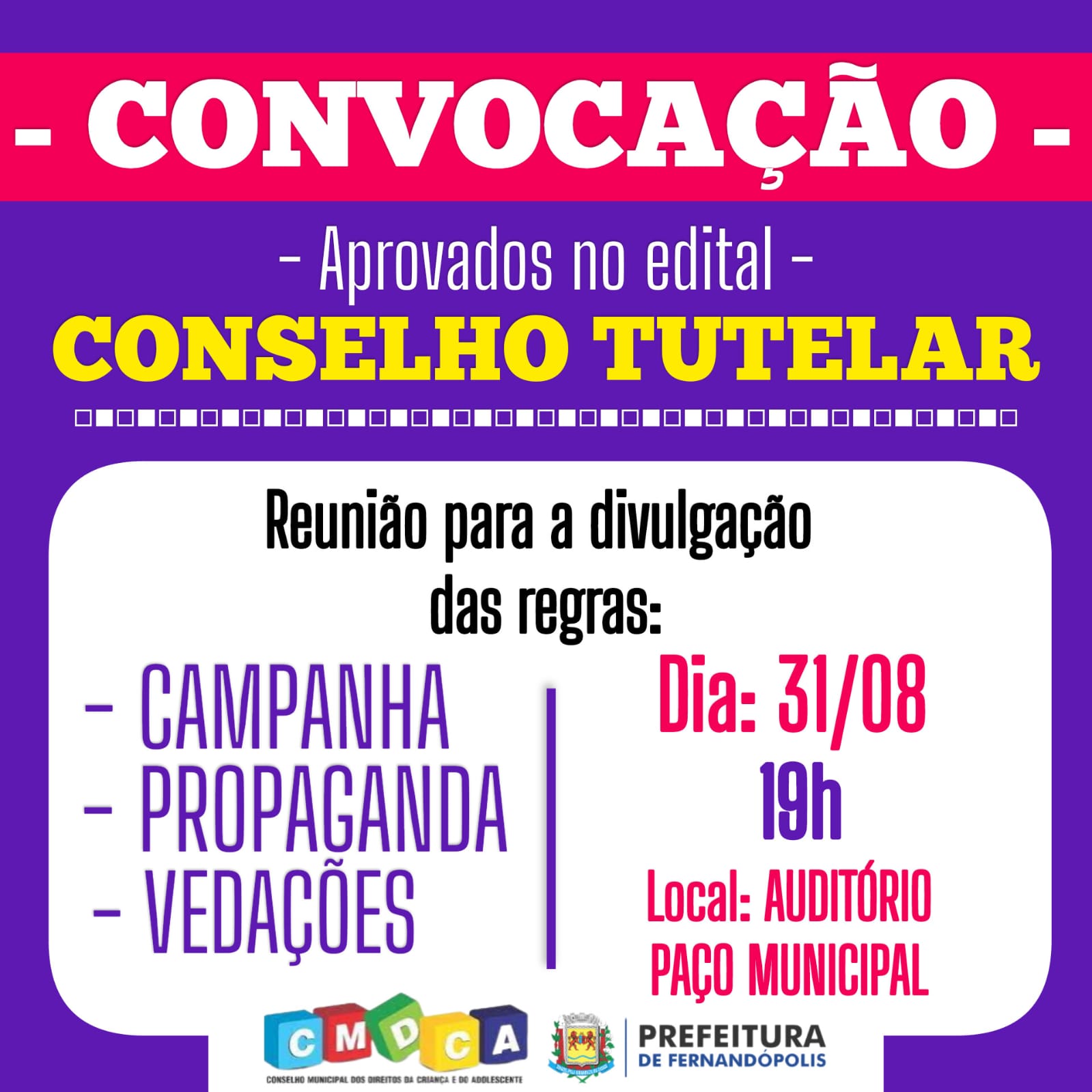 Todos os aprovados no exame psicológico estão convocados para participarem de uma reunião que acontecerá nesta quinta-feira, 31, às 19h, no auditório do Paço Municipal. O encontro, que faz parte da sétima etapa do processo, vai tratar de assuntos relacionados a campanha, propaganda e condutas vedadas durante esse período.