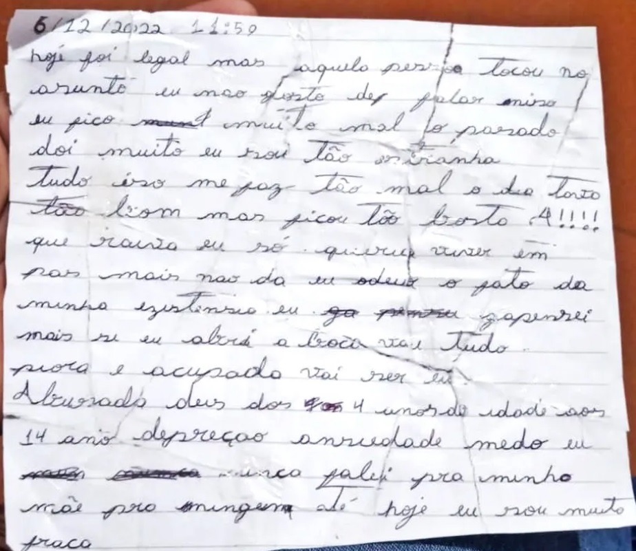 Em um trecho a adolescente relata que "só queria viver em paz, mas não dá. Eu odeio o fato da minha existência, eu já pensei, mas se eu abrir a boca, vai tudo piorar e a culpada vai ser eu. Abusada desde os 4 anos de idade, eu nunca falei para a minha mãe, para ninguém. Até hoje eu sou muito fraca”.