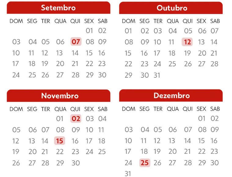 Após o desta semana, teremos em outubro o Dia das Crianças e de Nossa Senhora Aparecida no dia 12, uma quinta-feira; em novembro vem o Finados (02), também numa quinta e a Proclamação da República (15) em uma quarta-feira.