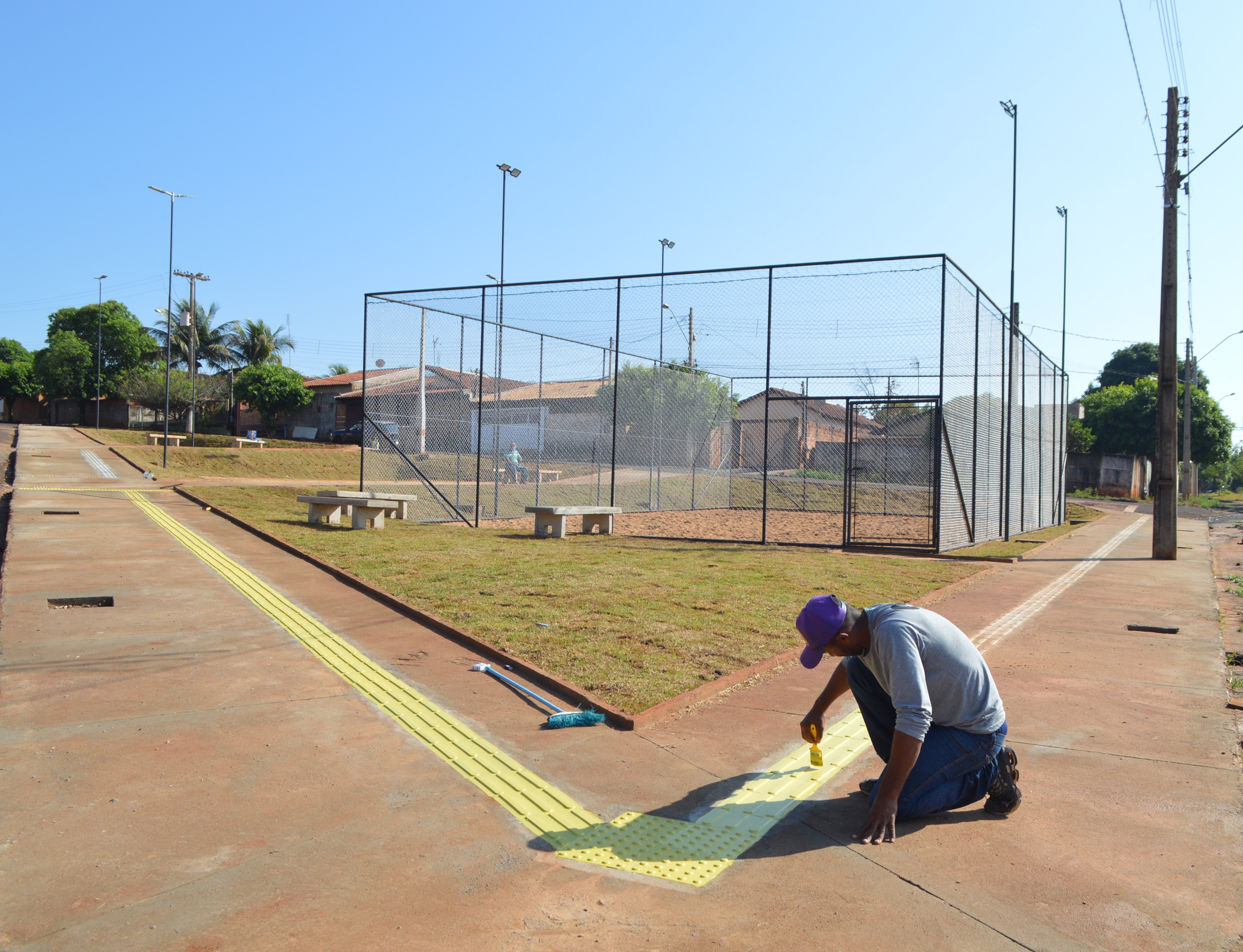 A nova praça do Bairro Bernardo Pessuto é composta com calçamento com piso tátil, quadra de areia com alambrados, bancos, paisagismo e iluminação led.