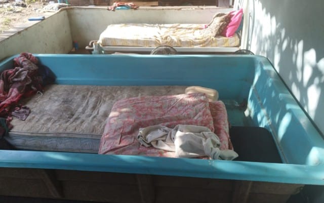 Foram alojados em condições degradantes. O local de moradia carecia de higiene e conforto, uma vez que não comportava o número de residentes, por ser bastante pequeno. Parte dos trabalhadores dormia na parte externa da casa, em uma área avarandada, em colchões distribuídos pelo chão, sujeitos ao frio e a outras intempéries. Dois trabalhadores dormiam dentro de uma piscina desativada, feita de fibra, também na área externa.