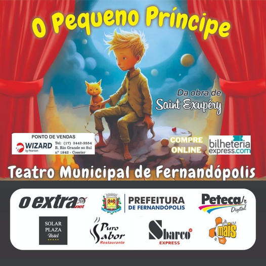 Com o apoio do Jornal O Extra.net, Puro Sabor Restaurante, Sbarco, Rádio Mais, Peteca Digital, Solar Plaza Hotel e Prefeitura de Fernandópolis, o Teatro Municipal recebe a peça 'O Pequeno Príncipe' no próximo dia 28, às 19h30.