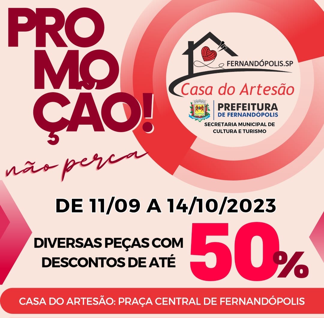 Como forma de celebrar o sucesso das visitações e vendas, a Casa do Artesão irá comercializar vários produtos com 50% de desconto até o próximo dia 10 de outubro. “Nossos artesãos estão muito satisfeitos e essa foi à forma encontrada para agradecer à população e aos visitantes de outras cidades”, finalizou Iraci.