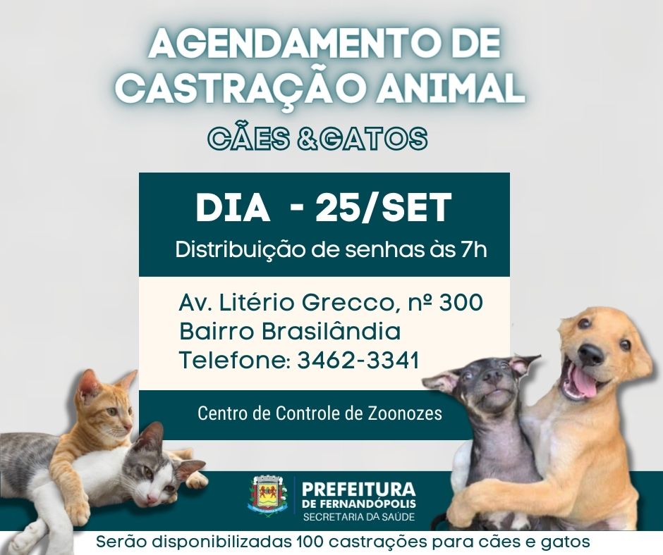A Secretaria Municipal da Saúde, por meio do Centro de Controle de Zoonose realizará na próxima segunda-feira, dia 25 de setembro, agendamento para a castração gratuita de animais. No total serão disponibilizadas 100 vagas entre cães e gatos para agendamento imediato.
