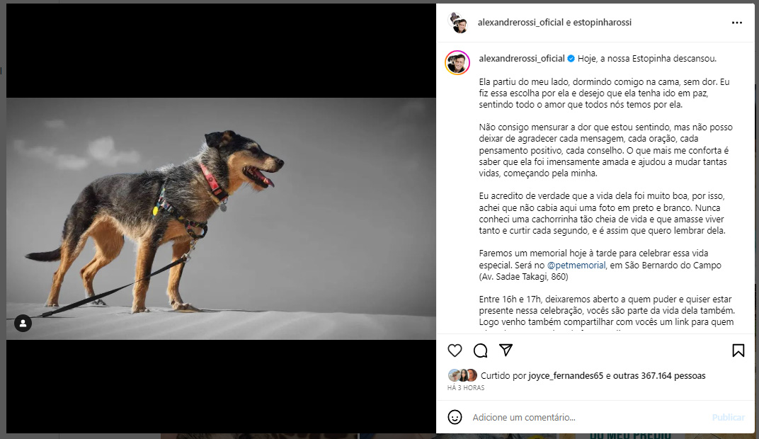 Rossi fará um memorial hoje à tarde para celebrar essa vida especial. Será no @petmemorial, em São Bernardo do Campo (Av. Sadae Takagi, 860).
