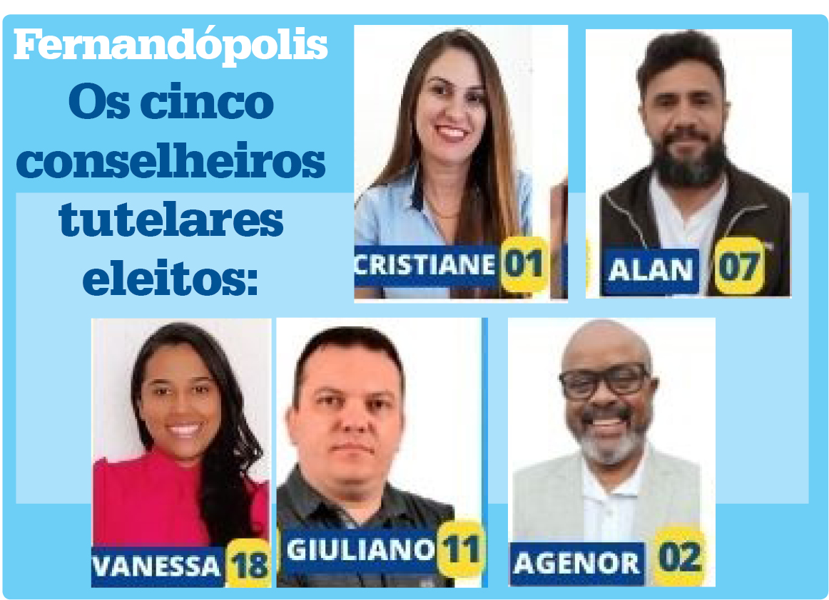 A apuração oficial do CMDCA – Conselho Municipal dos Direitos das Crianças e Adolescentes de Fernandópolis, com supervisão direta de uma Comissão Especial Eleitoral constituída para o pleito, com apoio da Prefeitura de Fernandópolis da eleição para a escolha dos cinco novos conselheiros tutelares do município encerrou-se com o seguintes eleitos: