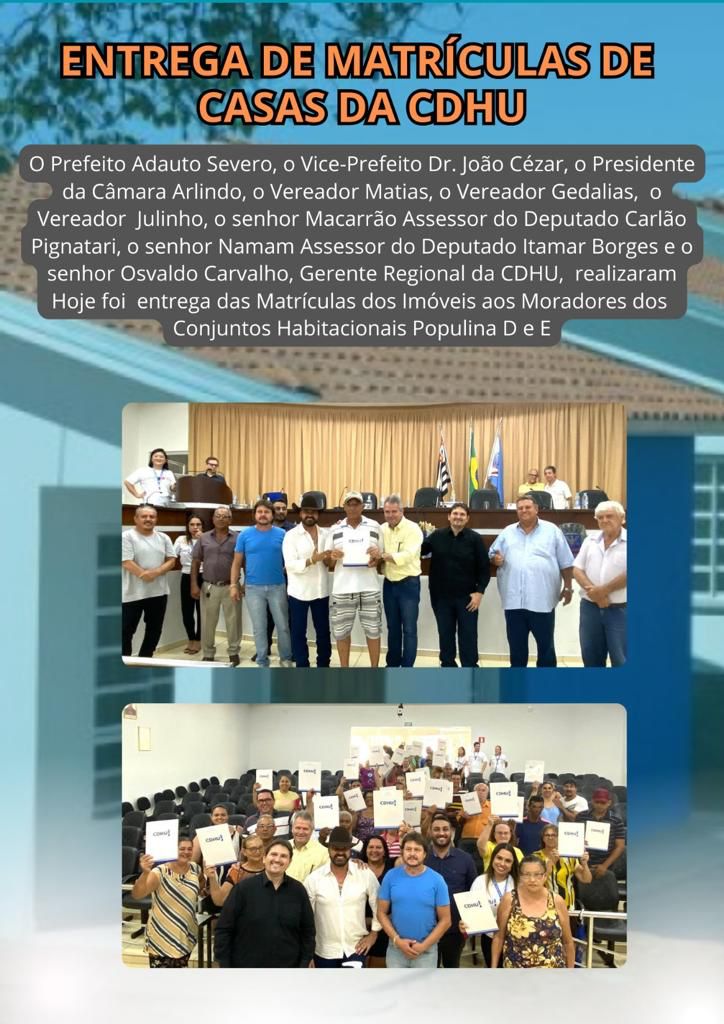 Em Populina, município localizado a 63 quilômetros de Fernandópolis, o prefeito Adauto Severo, o vice-prefeito João Cézar, o presidente da Câmara Municipal, Arlindo, os vereadores Matias, Gedalias, Julinho, além de Macarrão, assessor do deputado Carlão Pignatari, Namam, assessor do deputado Itamar Borges e Osvaldo Carvalho, gerente regional da CDHU, realizaram, recentemente, a entrega das matrículas dos imóveis aos moradores dos Conjuntos Habitacionais Populina D e E.