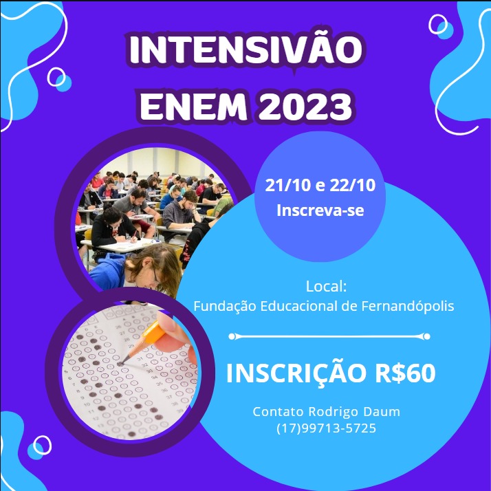 Será realizado, no próximo final de semana, dias 21 e 22 de outubro, em Fernandópolis, um Intensivão para o Exame Nacional do Ensino Médio (ENEM) na Fundação Educacional de Fernandópolis.