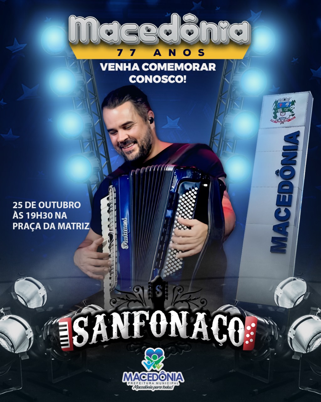 A Prefeitura de Macedônia convida a população para participar dos festejos dos 77 anos do município. “Venha comemorar conosco a trajetória e evolução do nosso município”, destaca a Administração Municipal.