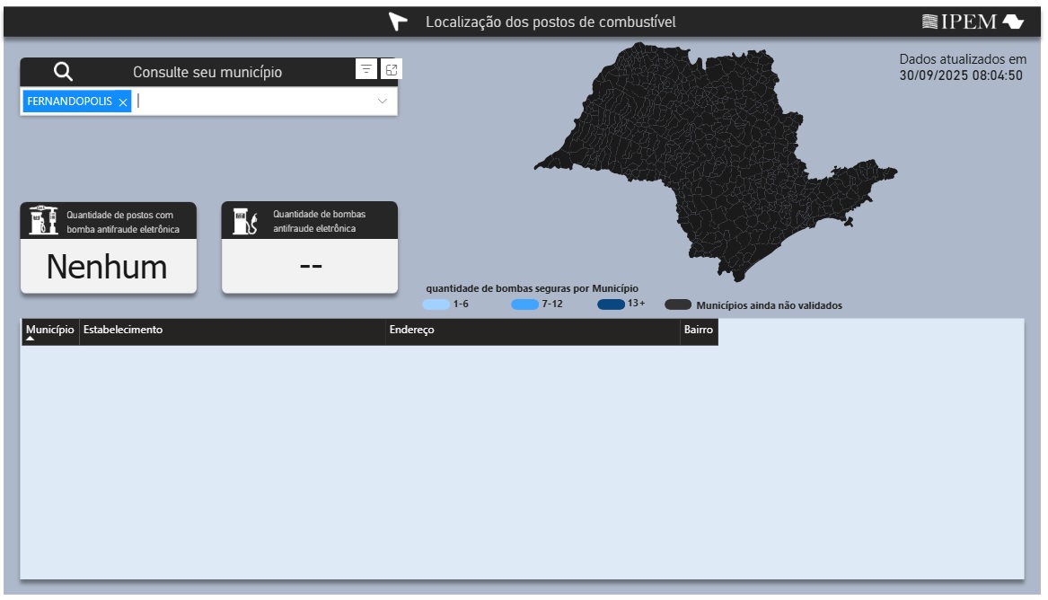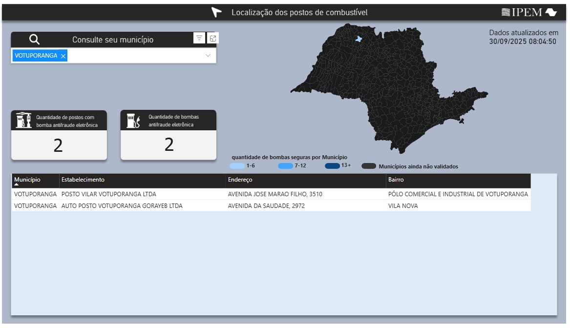 Disponível na página do Ipem-SP, a ferramenta permite que consumidores localizem postos de combustíveis que utilizam bombas certificadas e mais seguras, contribuindo para a transparência nas relações de consumo e para o combate a fraudes no setor, prezando pela segurança dos cidadãos e pela justa concorrência para aqueles que comercializam dentro das regras.