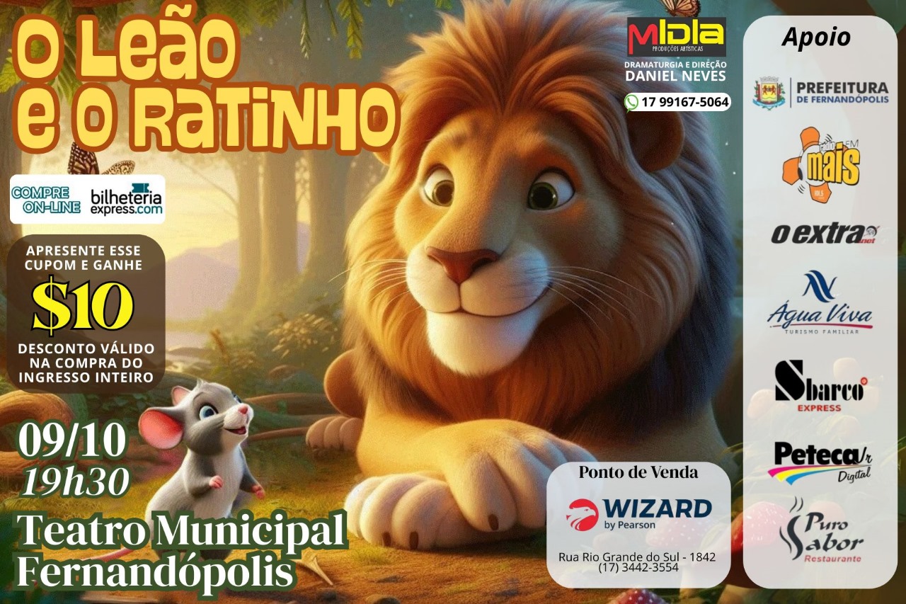 O público de Fernandópolis terá a oportunidade de assistir a um espetáculo encantador e cheio de lições de vida nesta quinta-feira (9), às 19h30, no Teatro Municipal da cidade. A peça “O Leão e o Ratinho”, inspirada na clássica fábula do pensador grego Esopo, promete divertir e emocionar crianças e adultos em uma montagem que mistura teatro, música e circo.