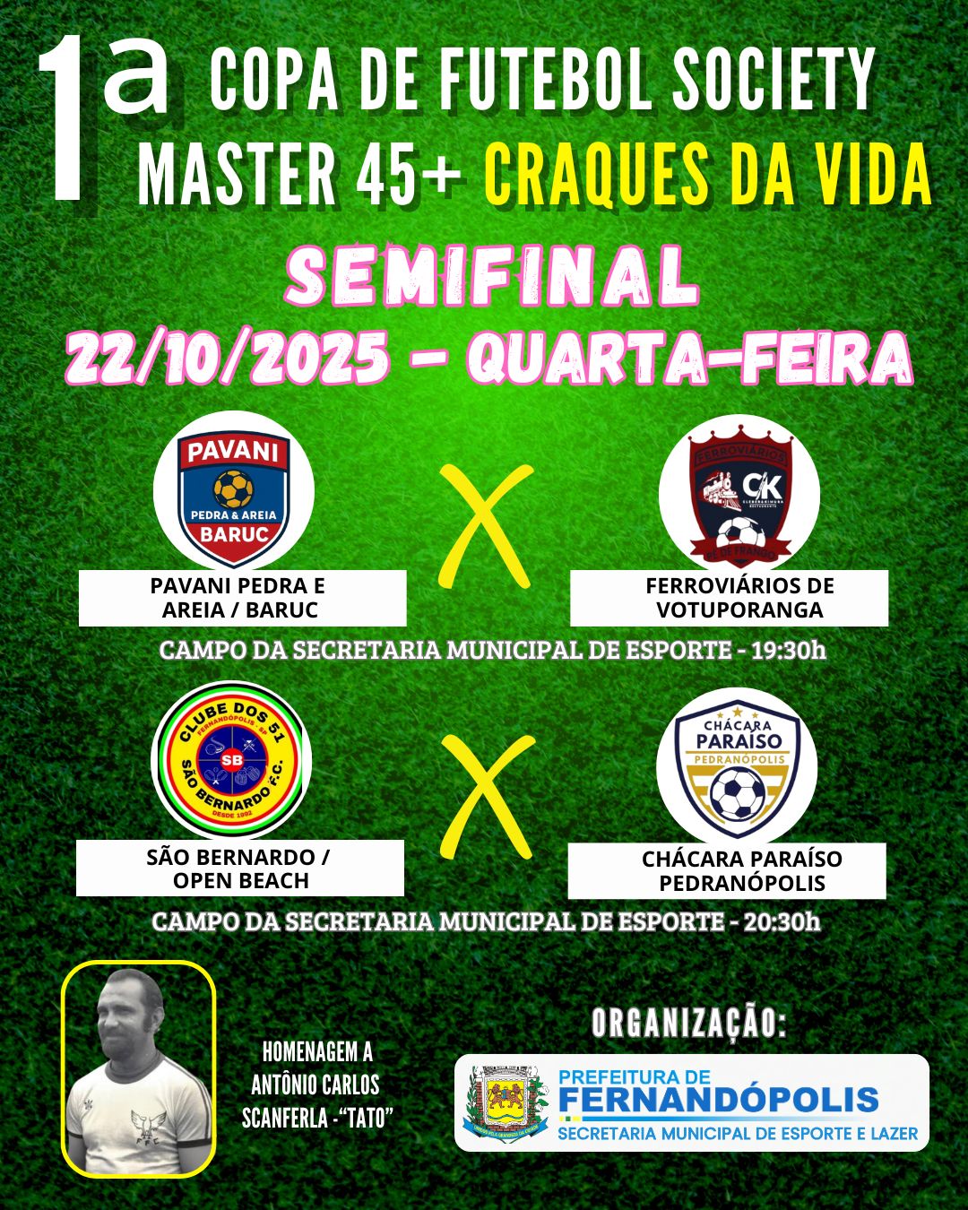 As semifinais da 1ª Copa de Futebol Society Master 45 + “Craques da Vida”, organizada pela Secretaria Municipal de Esportes e Lazer de Fernandópolis, é o grande atrativo da noite desta quarta-feira, 22.