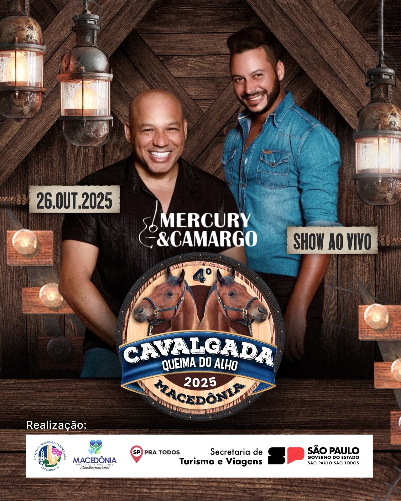 A tradição também tem seu espaço na programação! No domingo, acontece a 4ª Cavalgada e Queima do Alho de Macedônia, reunindo comitivas de toda a região em um dos eventos mais esperados do ano.