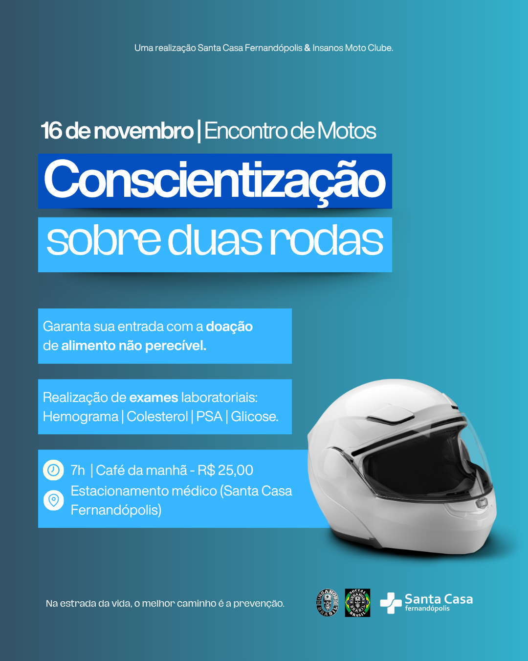 Com o tema “Conscientização em Duas Rodas”, o estacionamento da Santa Casa se transformará em um ponto de encontro de solidariedade e saúde. A partir das 7h da manhã, os portões estarão abertos para receber a população com uma exposição de motos e um delicioso café da manhã.