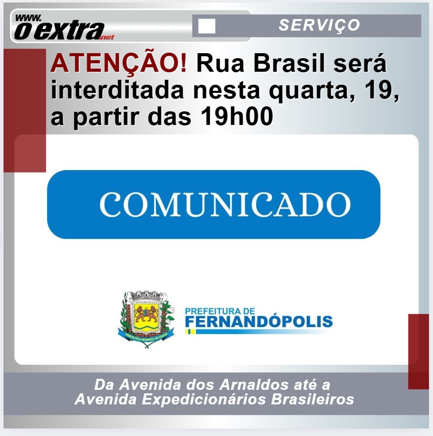 A Prefeitura Municipal de Fernandópolis acaba de emitir Comunicado Oficial relatando a interdição de trânsito na Rua Brasil nesta quarta-feira, 19, a partir das 19h00. Confira-o, na integra: